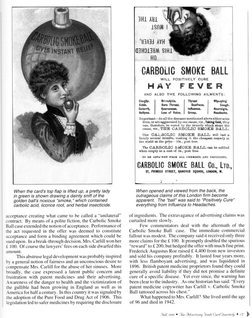 MORE from AI … The Carbolic Smoke Ball was a 19th-century, ineffective product that claimed to prevent influenza and other ailments, but it is primarily known for its role in the landmark English contract law case, Carlill v. Carbolic Smoke Ball Co. in 1893.